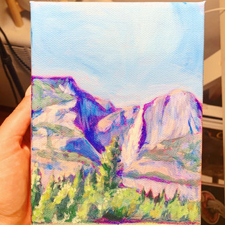 Later in the week we made our way to Yosemite National Park to stay for a few days. We stayed just outside of the park at an adorable A-Frame Airbnb and drove to Yosemite Valley both days for some hiking. By some hiking I mean a LOT of hiking. On day 2 we hiked the 15 mile John Muir trail to the base of Half Dome. We saw breathtaking waterfalls, misty rainbows, a few snakes, and the view at the top of the surrounding mountains and the adventurous people using cables to climb up the side of Half Dome. We stopped there for lunch and I sketched a few ideas to paint later on. In one sketch of half dome, you'll see the bird who swiftly flew away with my friend Julia's long awaited sandwich.